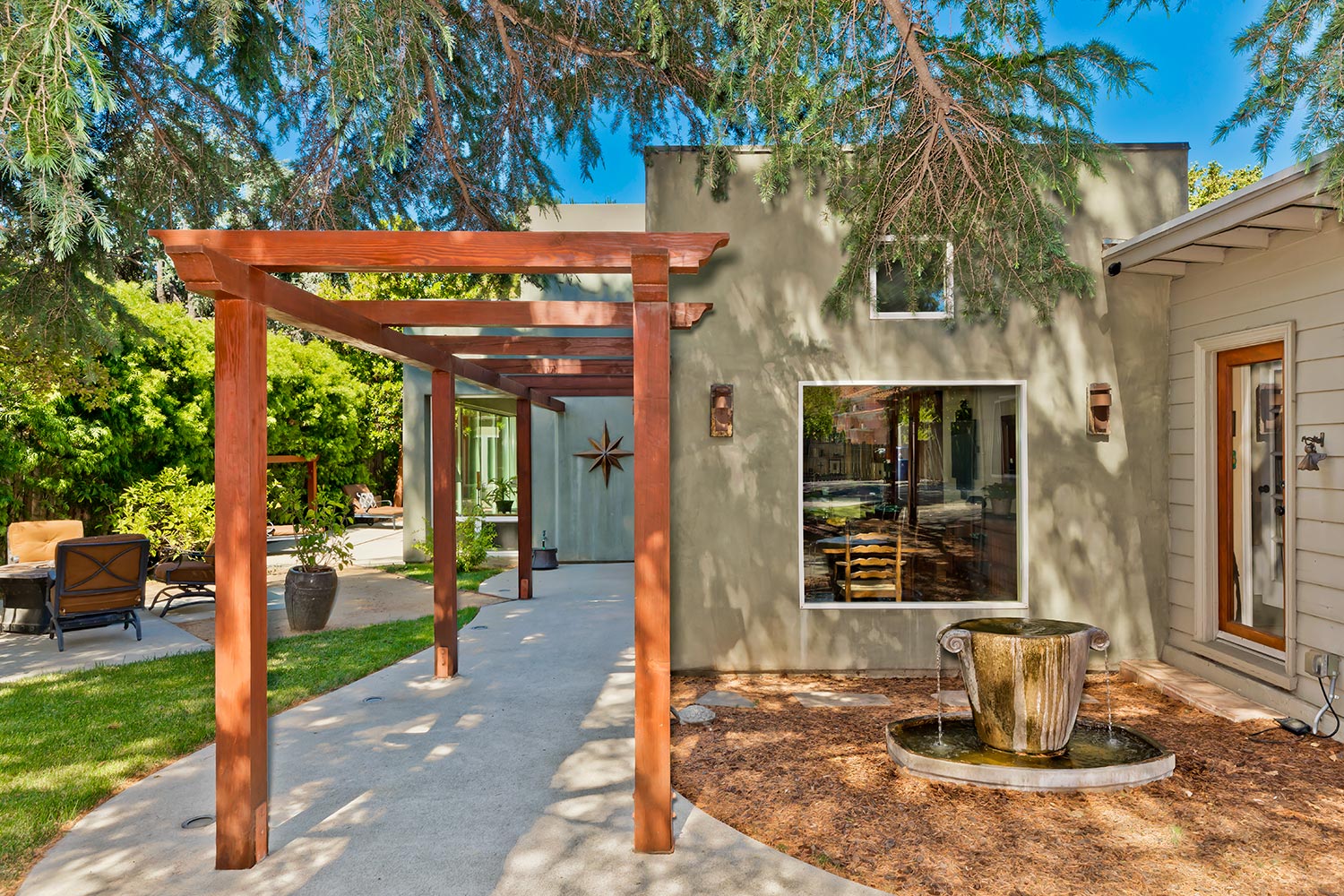 Welcome to your private, remodeled oasis featuring 5 bedrooms, 3 baths in a park-like setting! As you enter this beautiful home, you are immediately surrounded by mature trees, large gated/grassy yard & an entertaining patio complete w/dining pergola, fire pit & water feature. Updated chef's kitchen w/stainless steel appliances, 6-burner Viking range/oven, Viking refrigerator, upgraded cabinets & Paperstone counters. Beautiful concrete floors, great room w/10-foot ceilings, fireplace & sliding doors create an ideal indoor/outdoor flow. Master retreat features vaulted ceilings, walk-in closet, spa-like bathroom w/Carrera marble countertops, wood-like tile & shower w/bench & frameless glass doors. Four additional bedrooms/bath include a guest suite w/private bath & separate entrance. Work from home in additional private office & with separate entrance. Trendy shopping/eateries nearby. A wonderful place to call home!